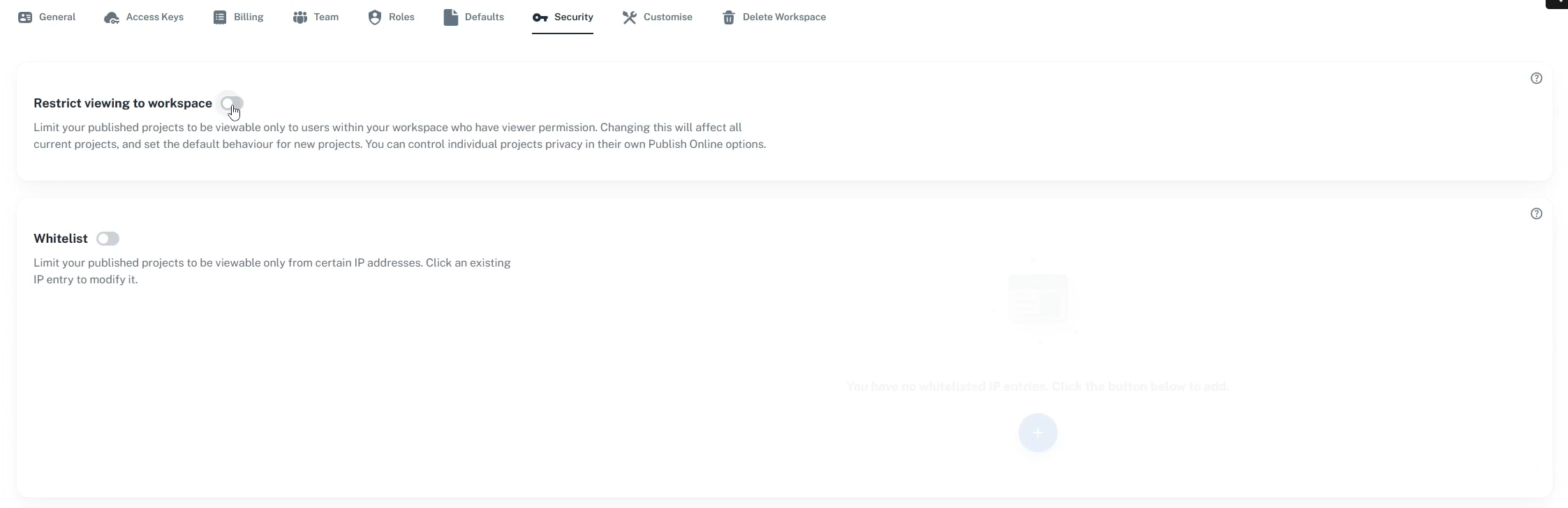- Globally, by navigating to Workspace → Security and enabling Restrict to Workspace. This applies the restriction to all existing projects and sets it as the default for new ones.
