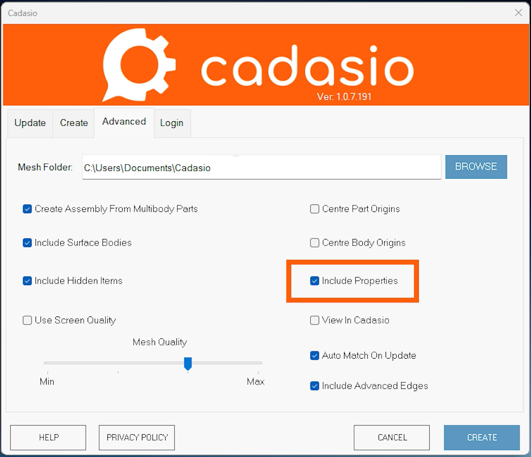 Every Cadasio CAD add-in includes an option to upload Meta Properties when creating or updating a project.