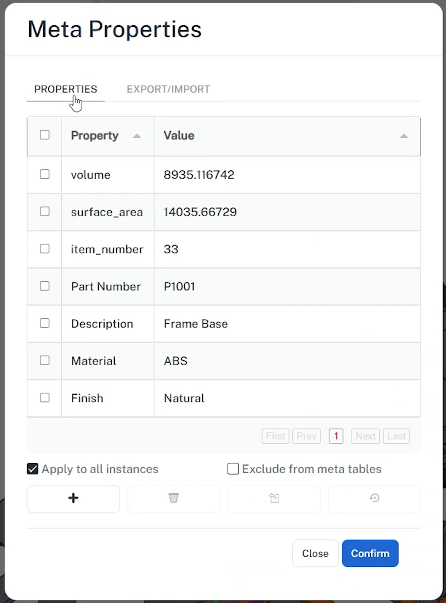 Cadasio allows you to export Meta Properties as either a CSV or JSON file using the Export/Import tab. You can choose to export properties for selected objects only, or for the entire assembly.