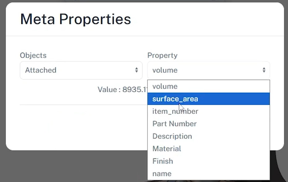 Meta Properties are additional data attributes stored on CAD objects. These might include part numbers, materials, finishes, descriptions, or any other information defined in your CAD system.